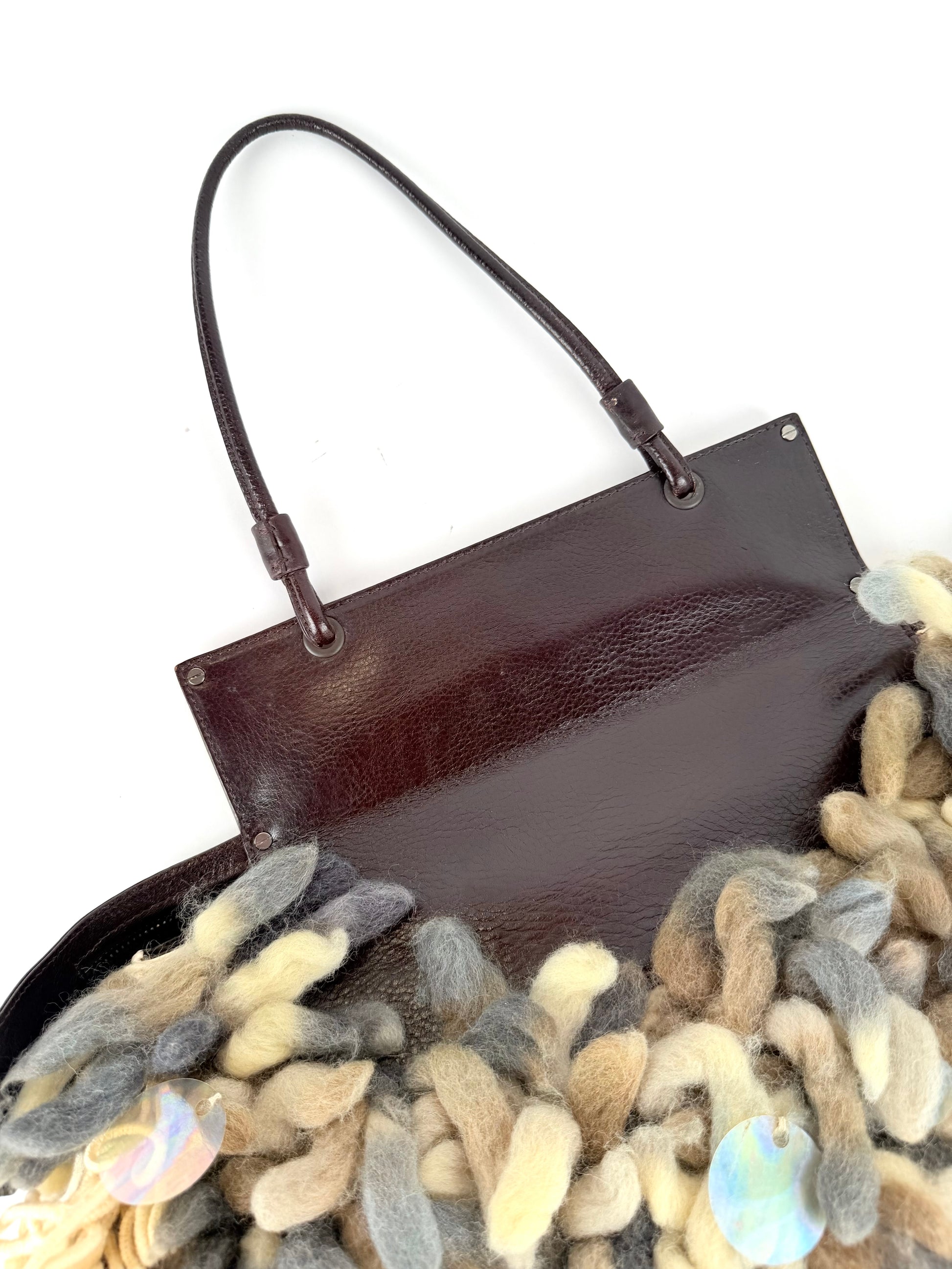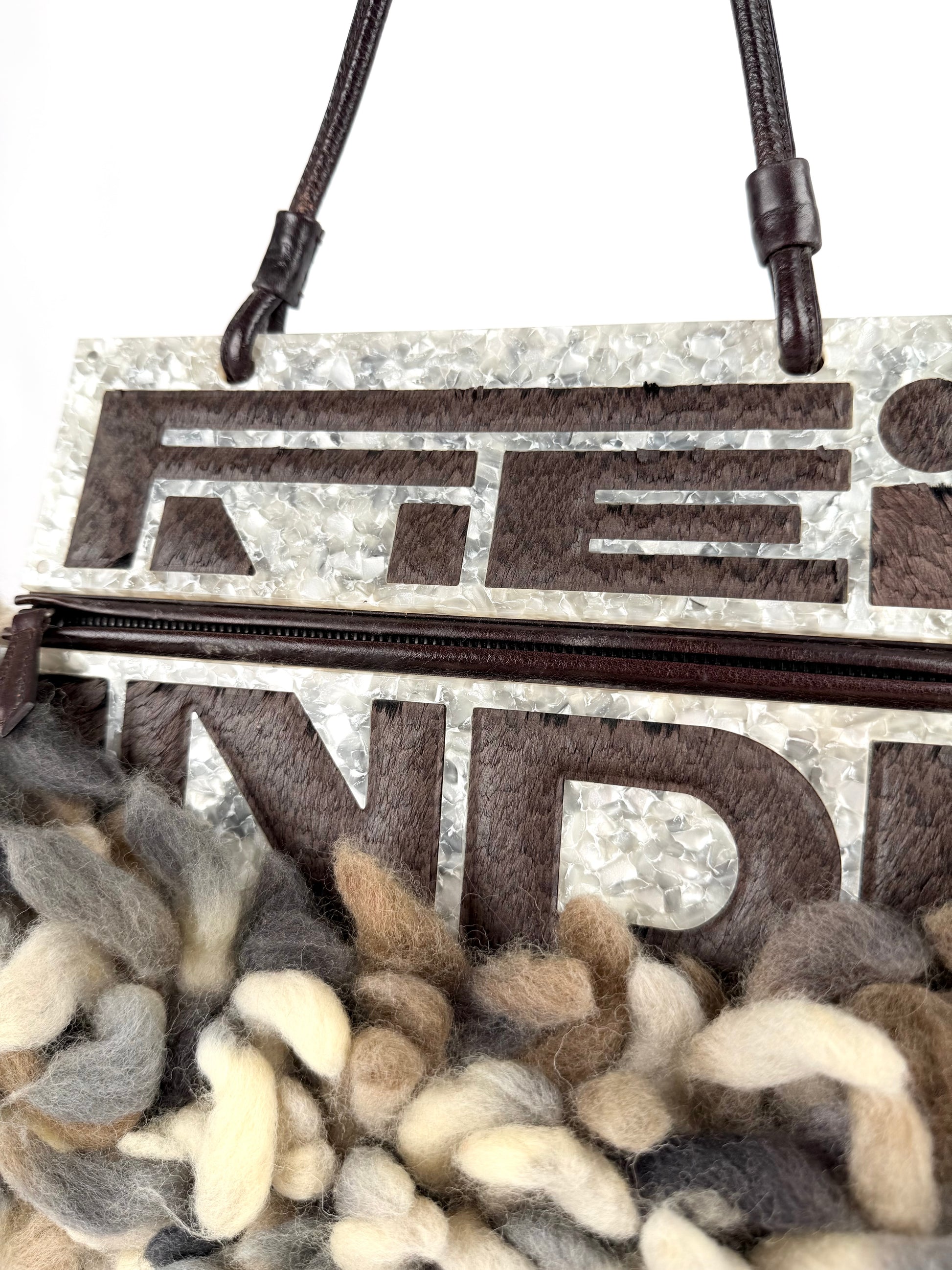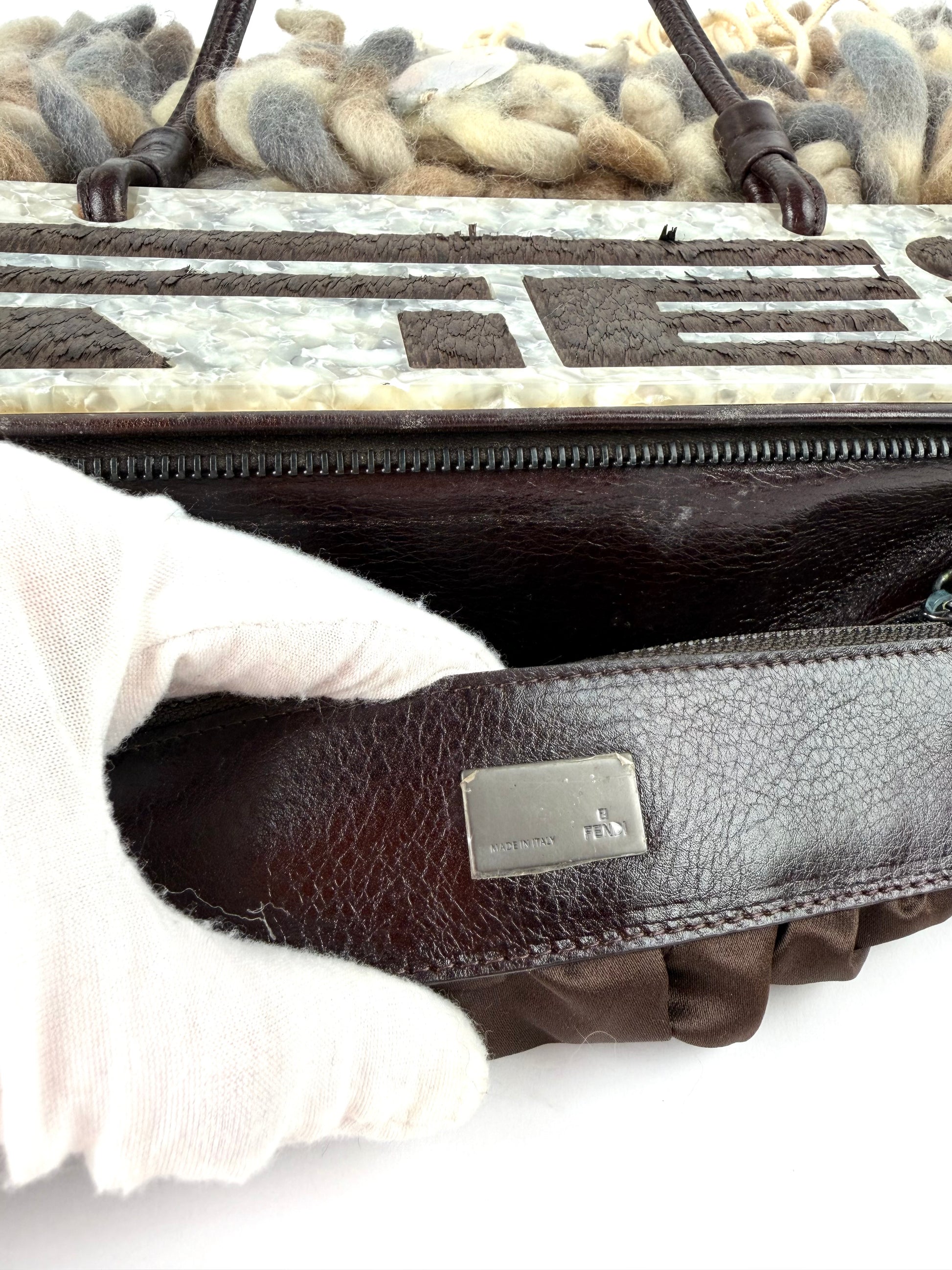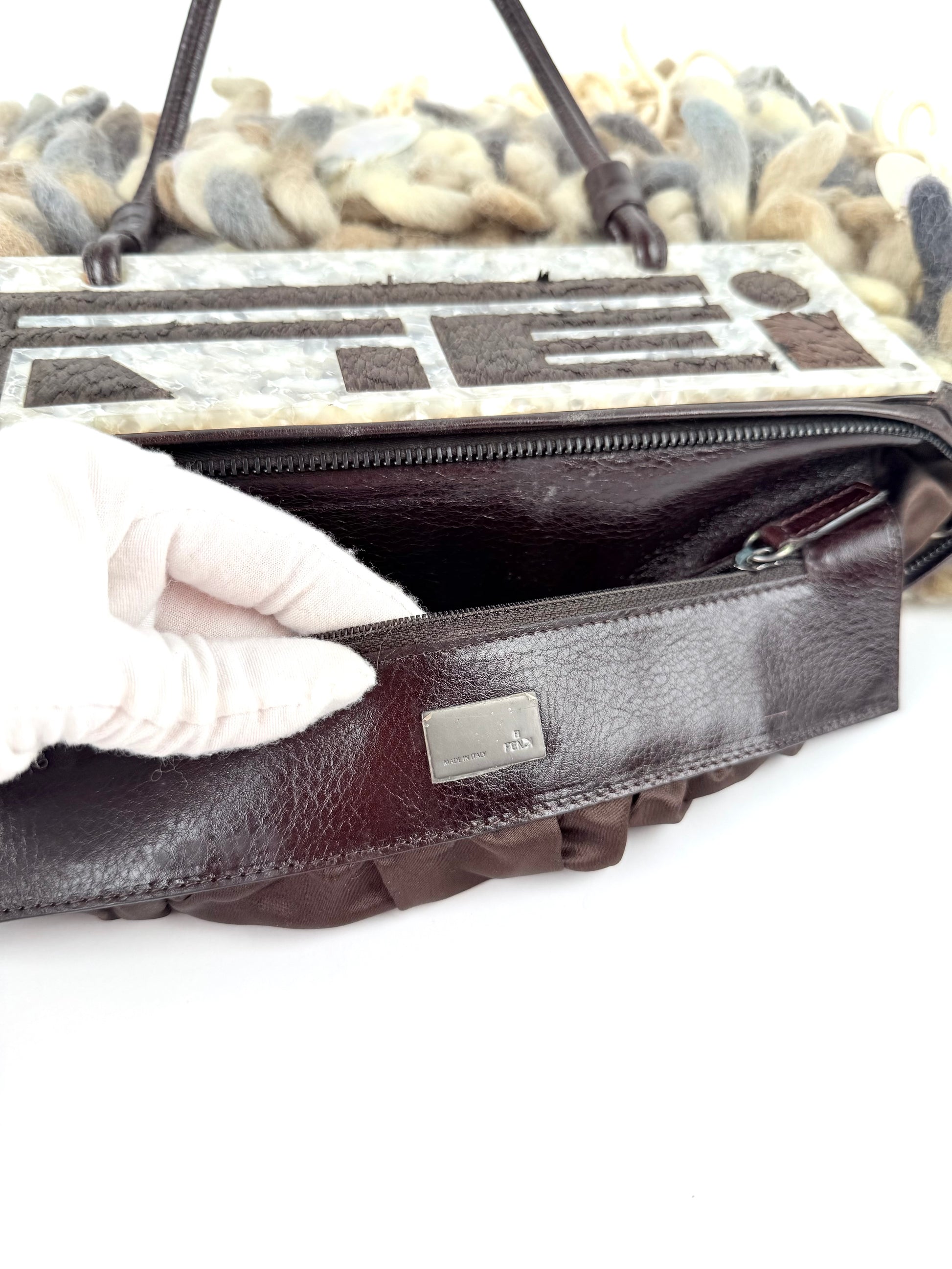 Fendi Fur Knit Acrylic Logo Handle Handbag Brown Multi
